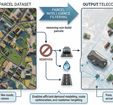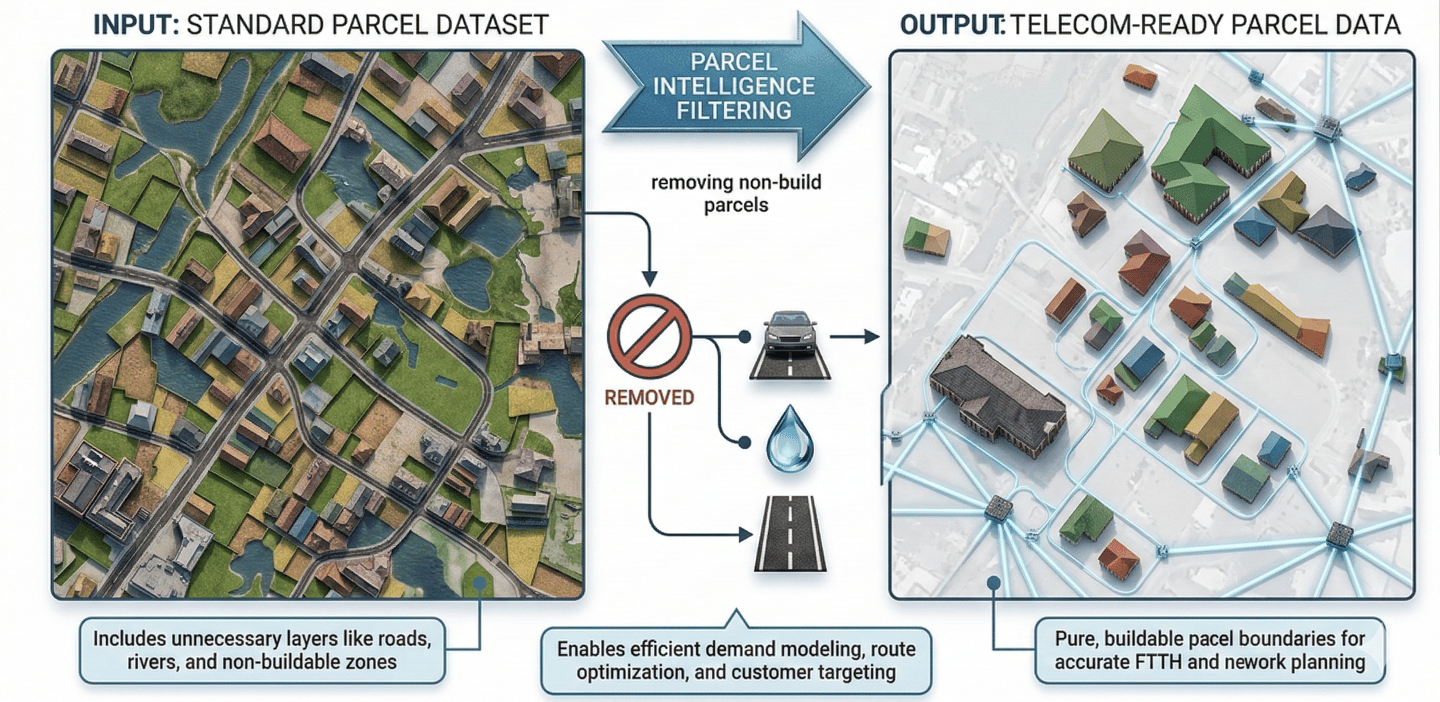 Provide telecom-ready parcel boundary datasets by removing non-build parcels such as roads, water bodies, etc.
